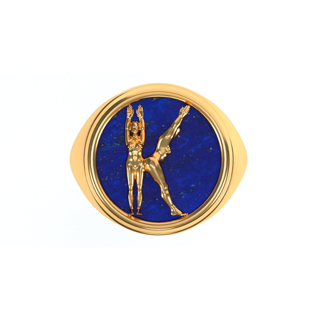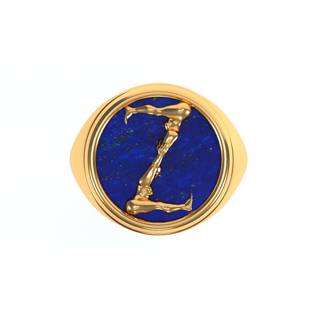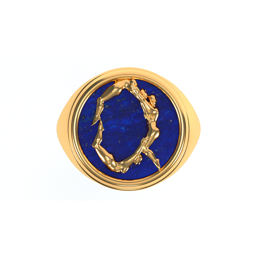 Paola Vilas Alphabet Ring in 18k gold is a wearable sculpture resembling the alphabet made of 18k gold and Lapis Lazuli, in a body-shaped design with the alphabet letters.