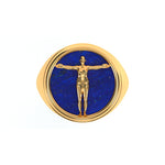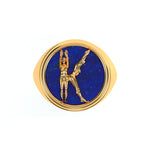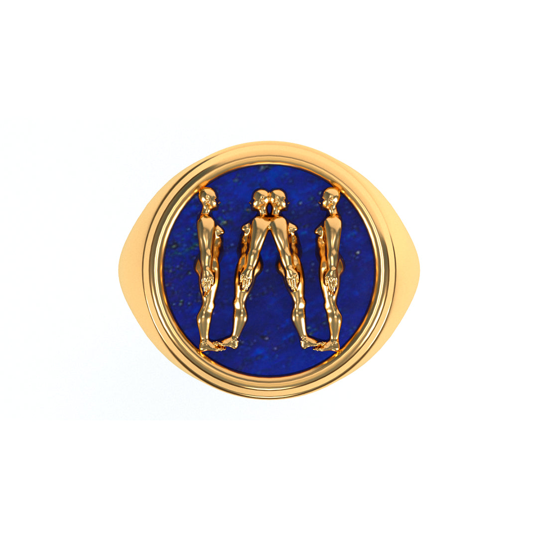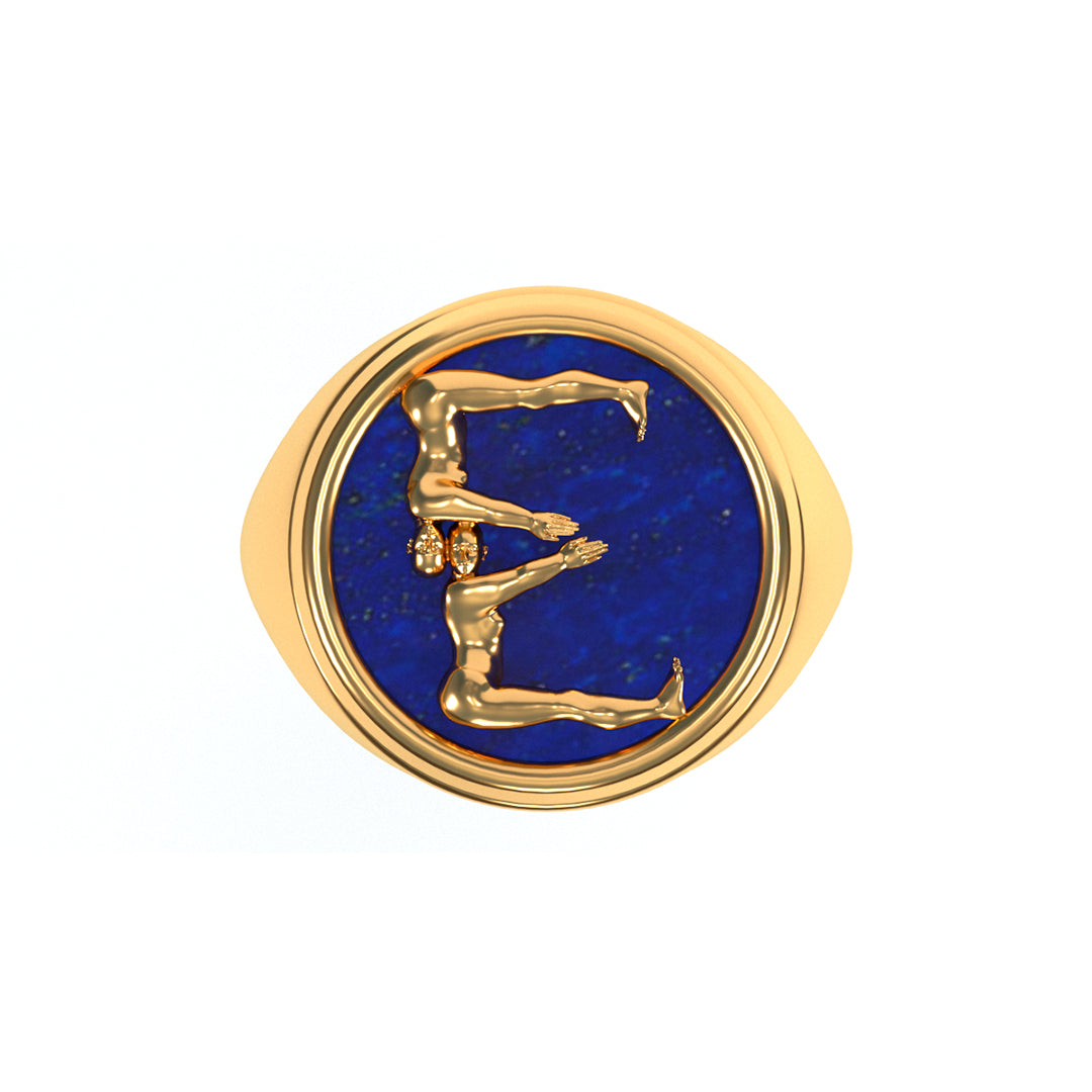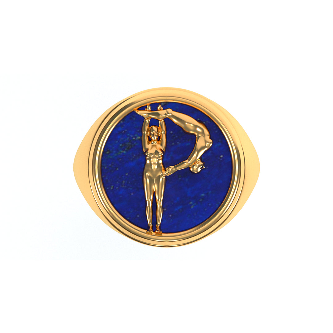 Paola Vilas Alphabet Ring in 18k gold is a wearable sculpture resembling the alphabet made of 18k gold and Lapis Lazuli, in a body-shaped design with the alphabet letters.