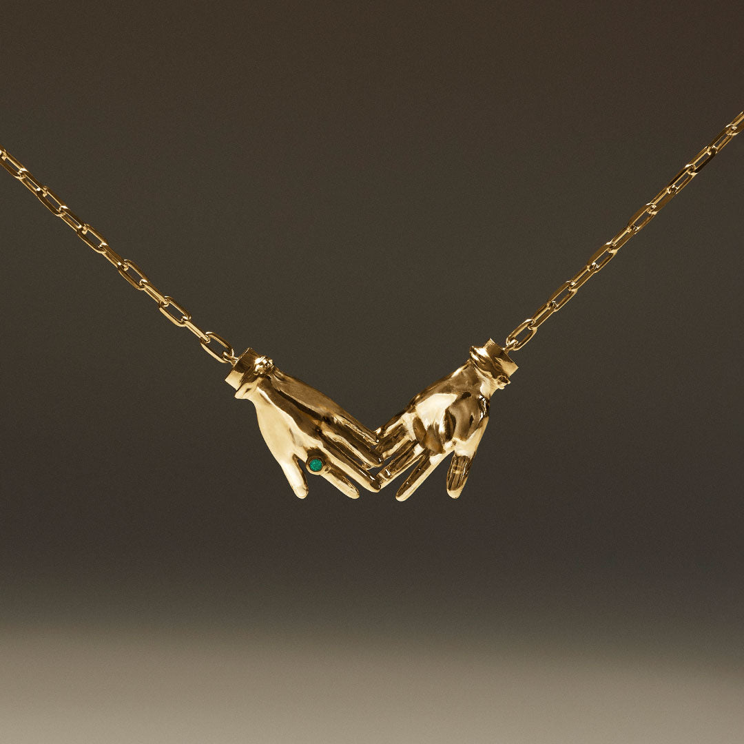 Hands are positioned as both embracing and leaving, symbolizing receptivity and abandonment. Inviting full attention to detail, the jewelry pieces are adorned with a Louise Bracelet, one of the brand's first and most emblematic pieces, alongside an emerald ring, opening a subtle door for dialogue amongst precious stones.