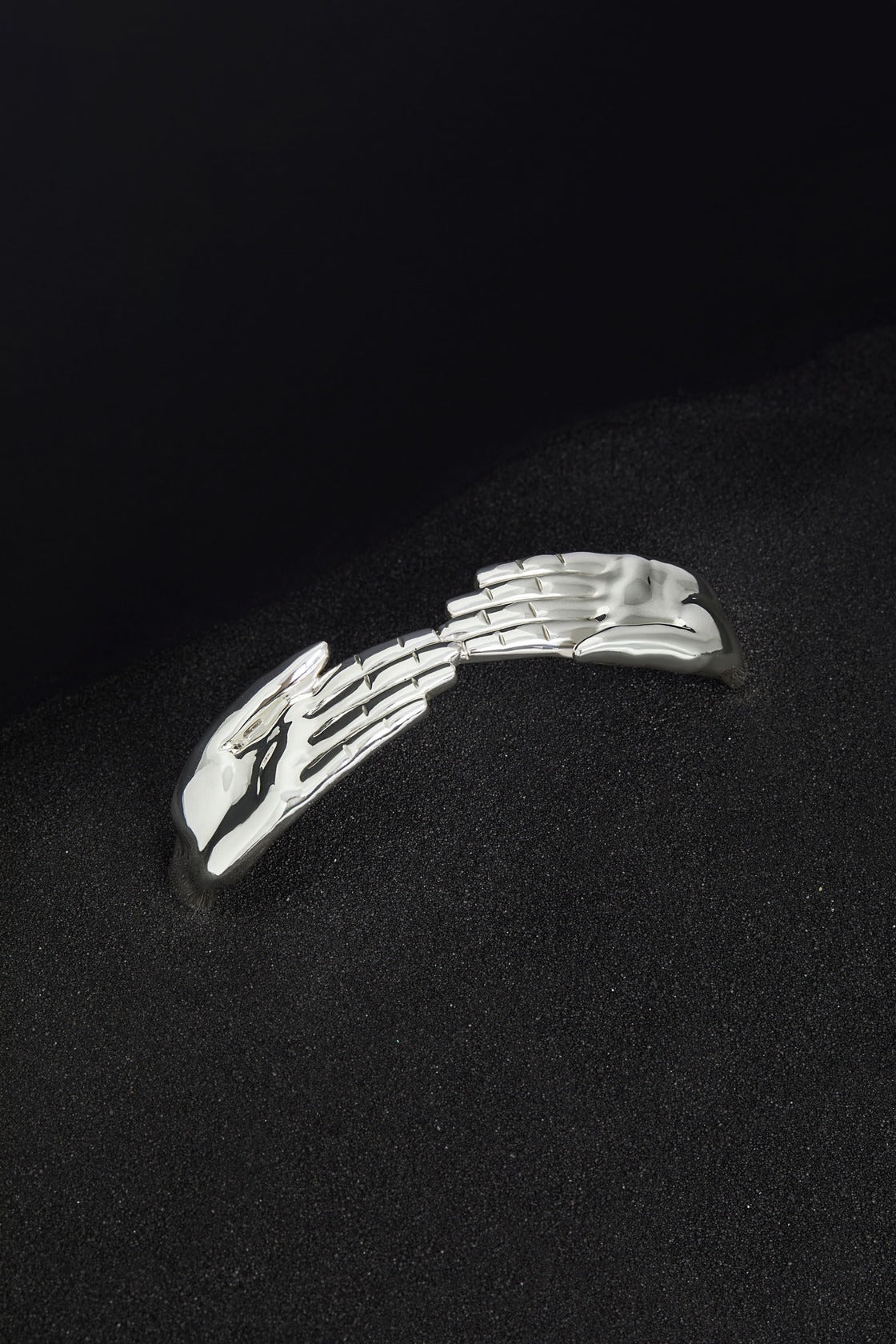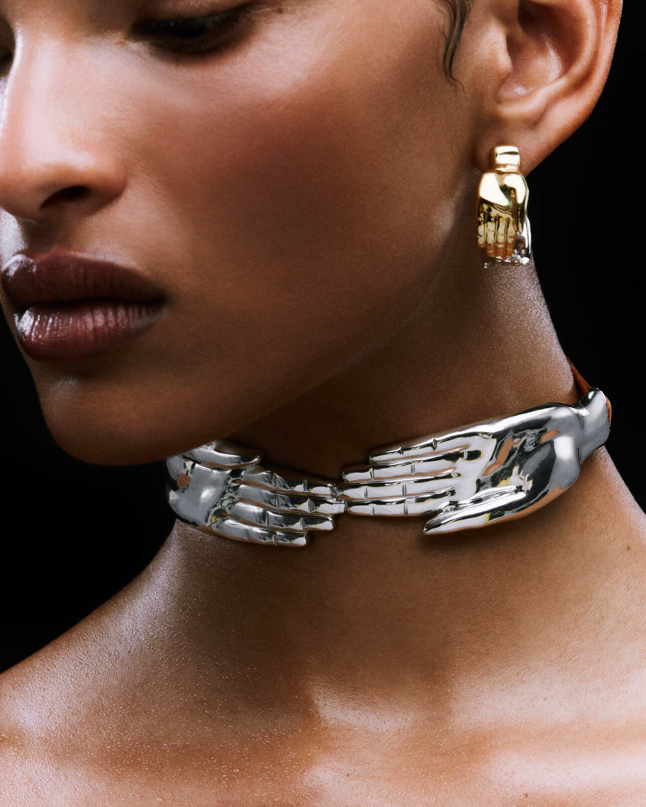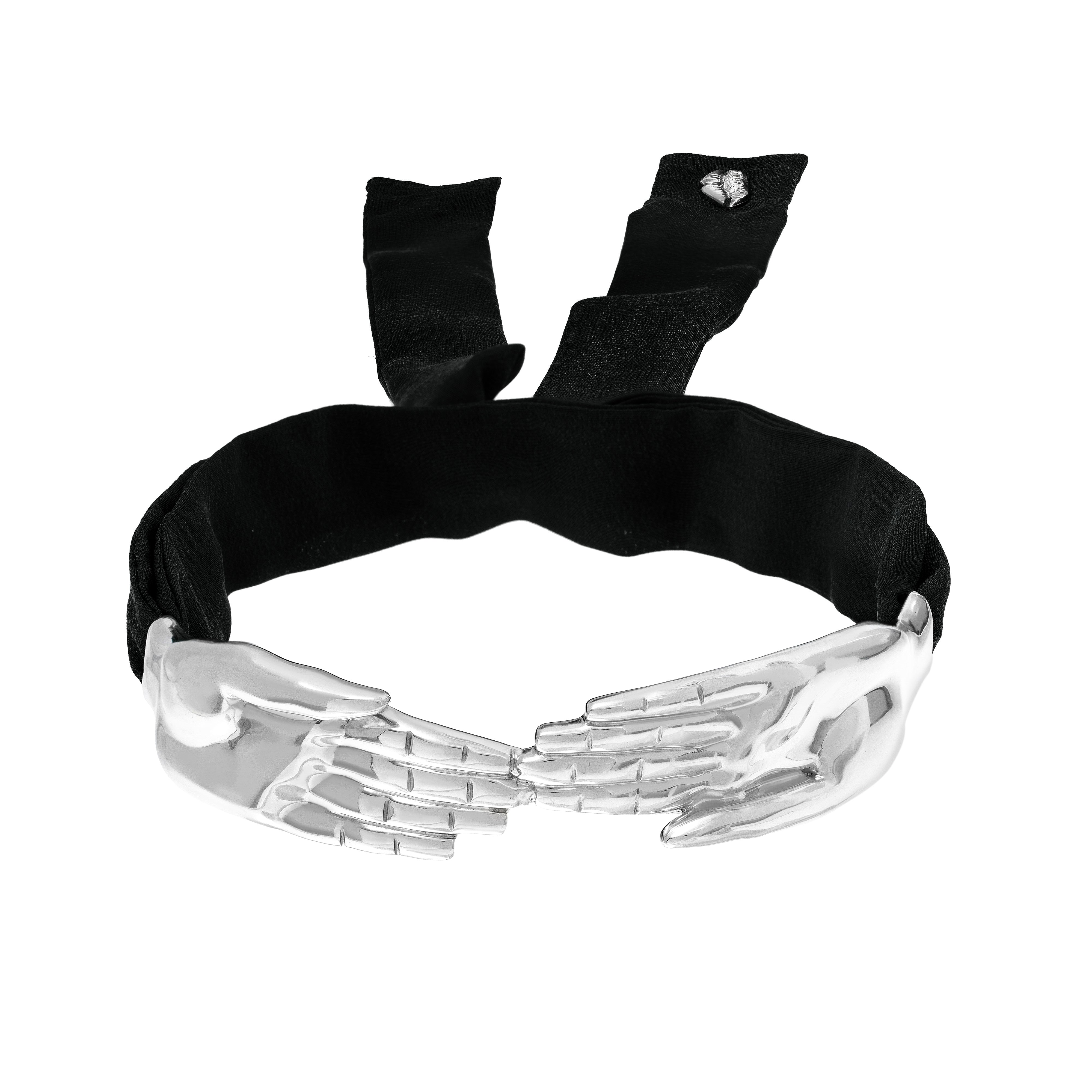 Designed to function as an amulet, the sculptural hands come together, merging into a single body that gives the piece an aura of protection. Its sinuous lines and elegant curves contrast with an unexpected geometry that lends it strength.