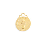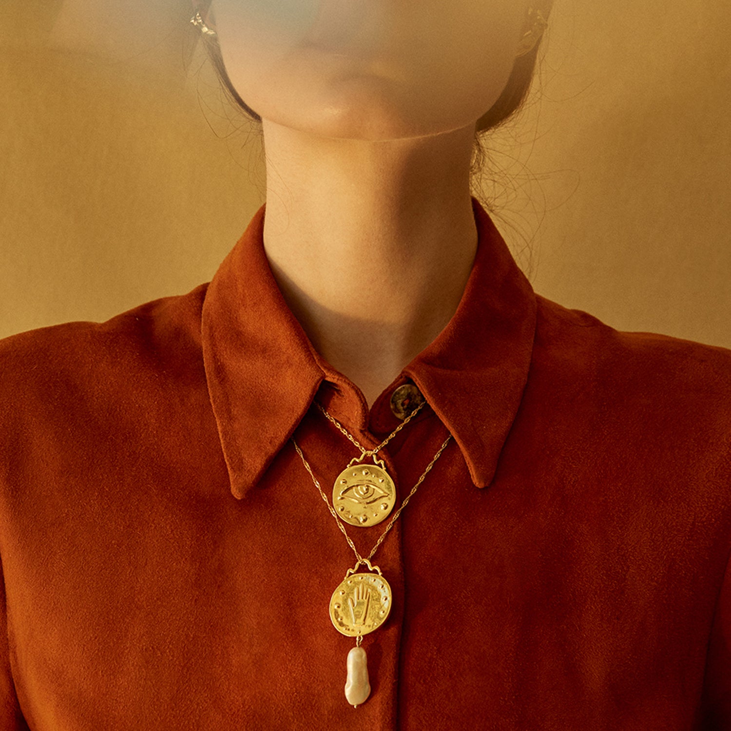 In Germaine, three symbols are used to give the piece a sense of talisman. Hand, eye and medal are archetypes of protection and connection with spirituality.