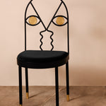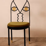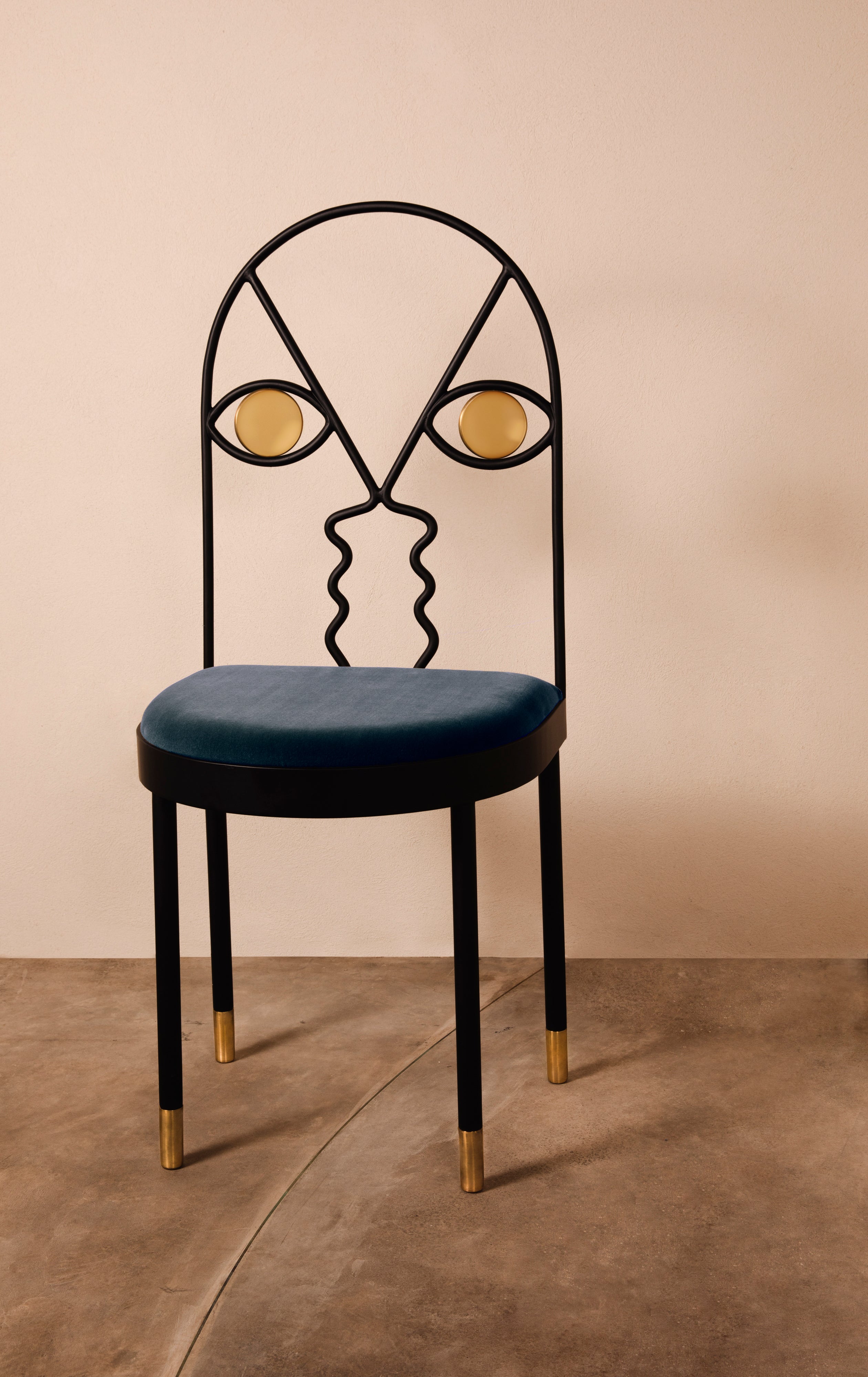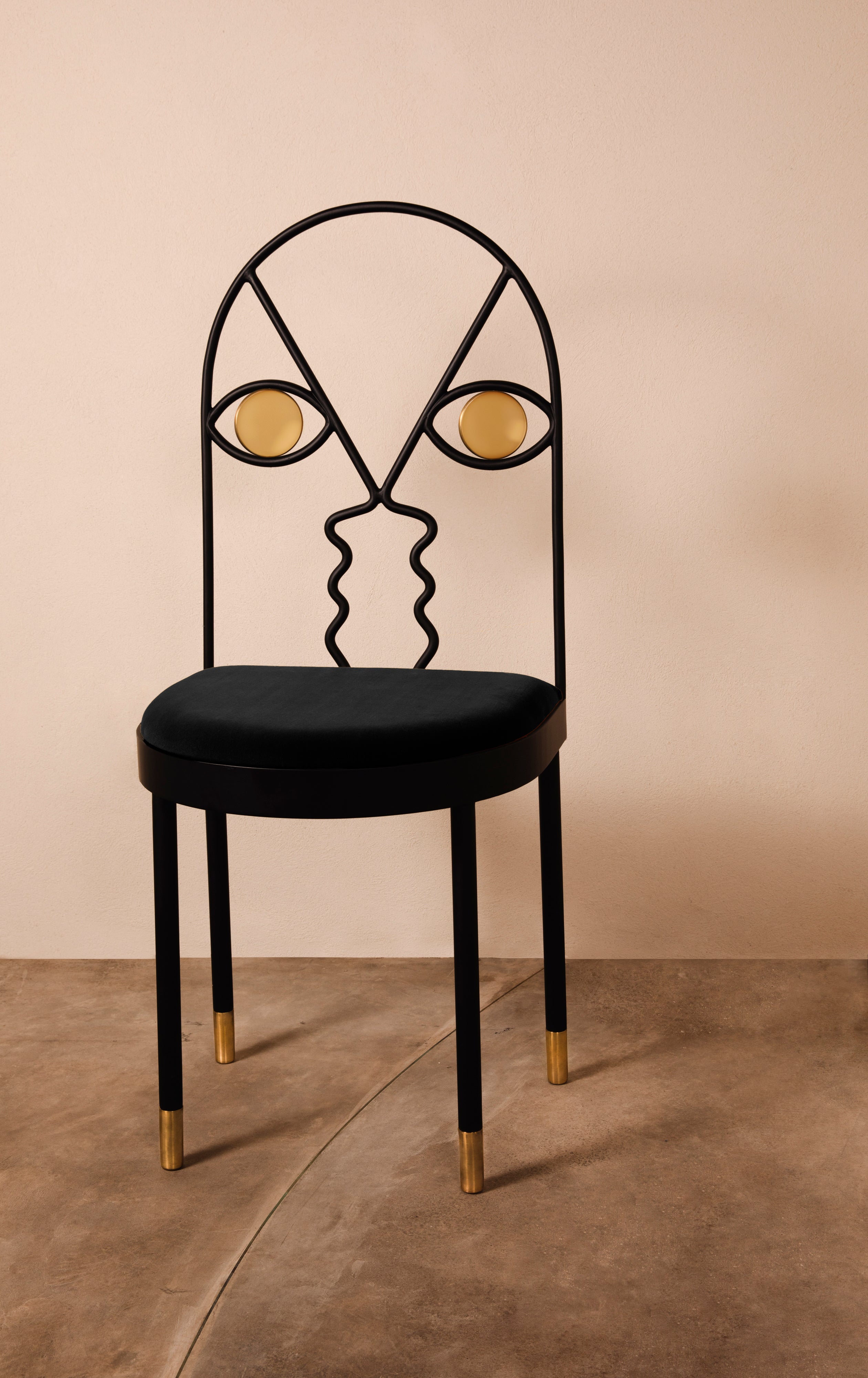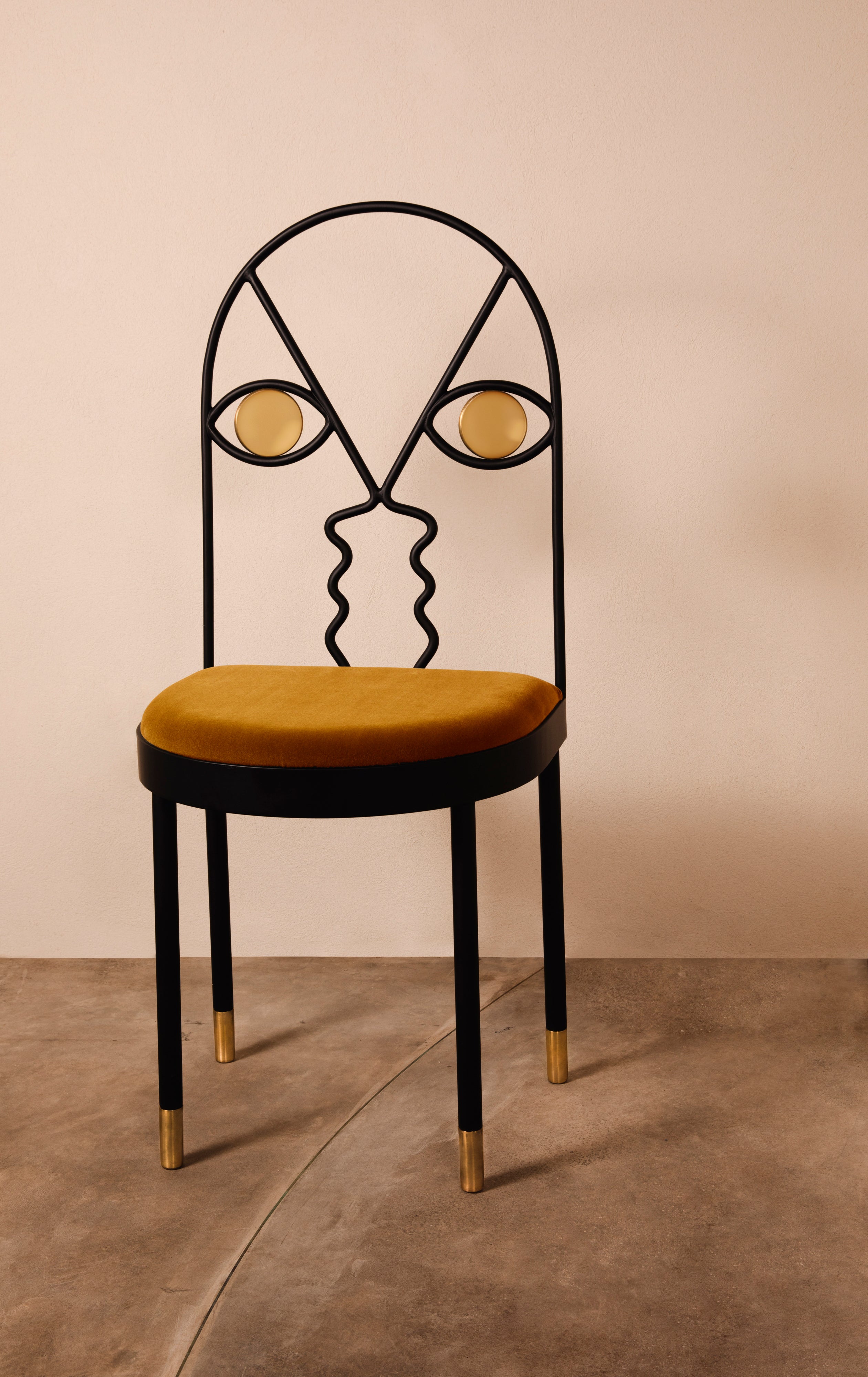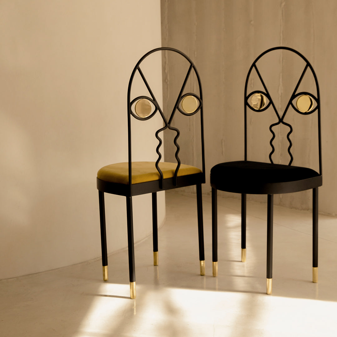 For the Henri chair, two profiles intertwine, constructing a whimsical narrative in the backrest. Its brass eyes swivel, allowing them to be directed at different angles. When arranged in front of a table, Henri chairs give the impression of peeking over, earning the nickname gossip chairs. Every curve forming its profile is skillfully hand-twisted by experienced artisans. The chair legs receive a brass finish that touches the floor, imparting lightness and a floating sensation. Available in various upholstery options, Henri chairs were designed to be clad in 100% cotton velvet in mustard, black, and green hues. Playing with a balanced interplay of solid and void, Henris are playful pieces that infuse homes with unexpected sophistication.At this moment, all of our home objects will be available to buy via e-mail, phone or Whatsapp link. For wholesale, please contact us below.