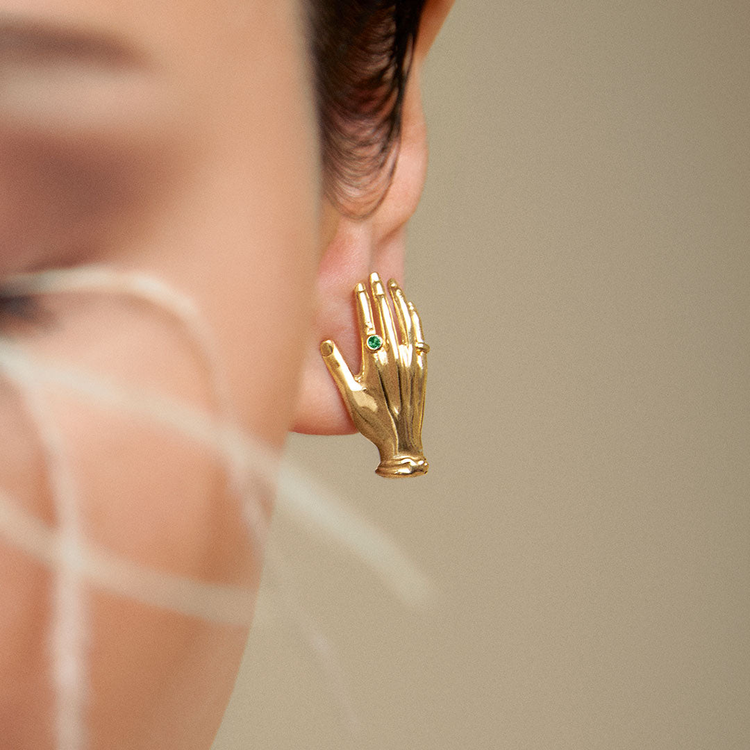 The Lia Earring by Paola Vilas is a wearable sculpture that celebrates the symbolism of the hand — a universal icon of creative power. Crafted in 925 sterling silver or 925 silver with 18k gold plating, this earring expresses the strength of gesture and creation in its purest, most essential form.