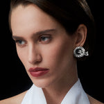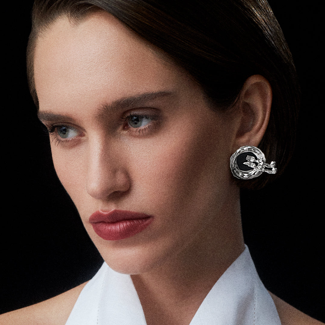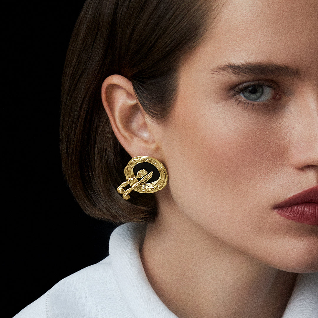 Paola Vilas Jewelry Madalena Earring is a wearable sculpture resembling plates and cutlery made of 925 sterling silver or 925 sterling silver with 18k gold plating.