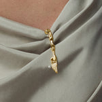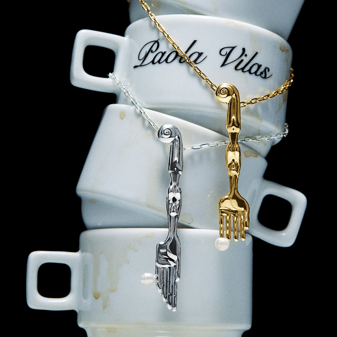 Paola Vilas Sofia Knife Pendant is a wearable sculpture resembling cutlery in a feminine body shape made of 925 sterling silver or 925 sterling silver with 18k gold plating and pearls.
