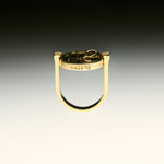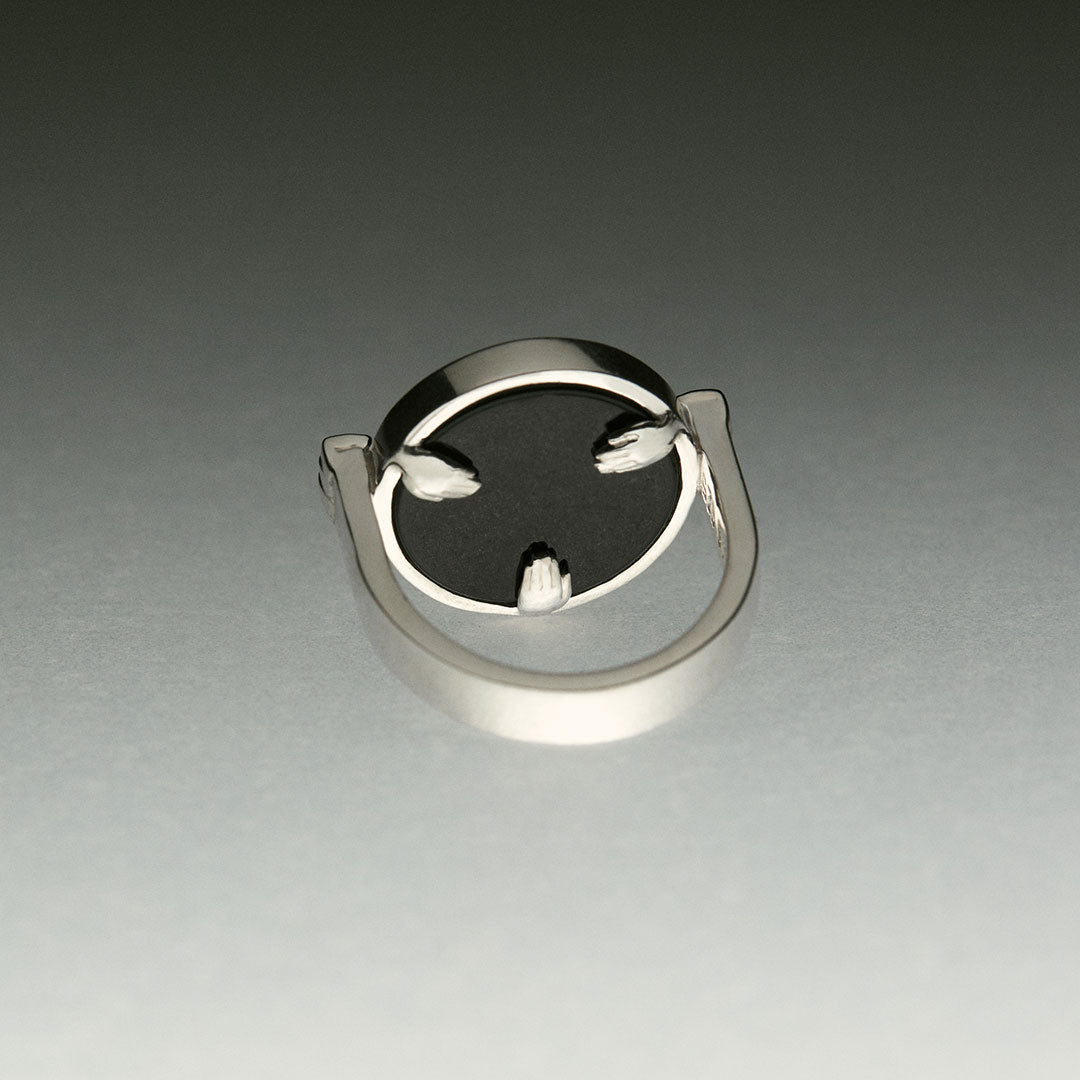 On the inside of the piece, three hands form a triangle, a symbol of sacred geometry and the balance between body, spirit, and universe. Crafted in 925 sterling silver, with an option in 925 sterling silver with 18k gold plating, the ring features black agate, a stone associated with protection and inner strength.